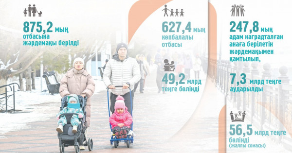 Көпбалалы отбасылар жәрдемақысы 627,4 мың отбасына (49,2 млрд теңге) берілсе, марапатталған анаға бері­летін жәрдемақымен 247,8 мың адам қамтылып, бұған 7,3 млрд теңге ауда­рылды.