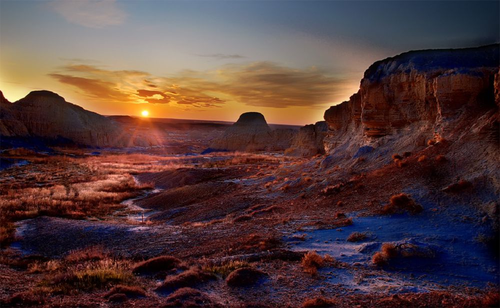 Осы сөздерді айтқан жолбасшымыз өзіміз әңгіме арқауына айналдырған жерге жете бергенімізде: «Аңғардың жалпы көрінісін мына шоқыдан қараңыздар», − деп шығыс жақтағы дөңге алып шықты. Міне, ғажап! Көз алдымызда қып-қызыл құм, қоңыркүрең тас қиыршықтарына толы өзгеше бір әлем жатыр. Олардың арасындағы ақ, сары, сұр керіш топырақты адырларда нендей белгі, мүсін жоқ дейсіз!.. Ескі қорған бейнесіндегі жақпартастар, пирамида мен қарауыл мұнараларын көзге елестететін төбелер, жантайып жатқан дулығалы батыр кейпіндегі белдер мен саңырауқұлақ секілді секітастар..., бәрі-бәрі бар. Олар адам қолымен емес, өкпек жел, долы дауыл, ақ жаңбыр мүжіген табиғат күші арқылы жасалған туындылар.