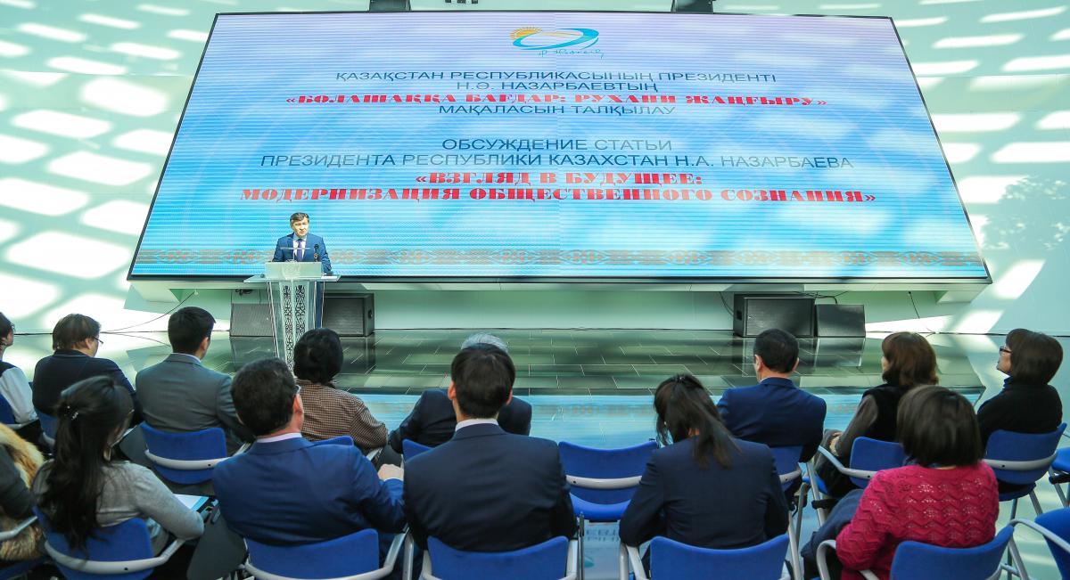 Президент Н.Назарбаевтың «Болашаққа бағдар: рухани жаңғыру» атты мақаласы қоғамда жан-жақты талқылануда. Жақында «Қазақстан Республикасының Тұңғыш Президенті – Елбасының кітапханасында» бағдарламалық еңбектің бас­ты бағыттары мекеме қызметкерлеріне насихатталды.