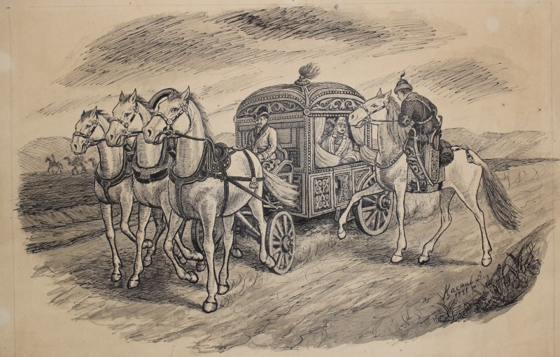 Бұл туынды Орал музейіне қалай тап болды? Музейдің қор сақтаушысы Мұхтар Өтестің айтуынша, сурет Т.Шевченко атындағы Қазақ мемлекеттік көркемсурет галереясынан Орал облыстық тарихи-өлкетану музейінің қорына 1961 жылдың қаңтар айында тапсырылған екен. Шамасы автордың өзі Қыз Жібектің айдай бейнесі оның туған жерінде тұрғаны жөн десе керек. Картинада үш ақбозды қатар жеккен күйменің салтанаты, Жібектің «жалғыз атты жолаушымен сөйлесуге намыстанып, тек Қаршығаның үгітінен кейін ғана бетін бір ашып, жарқ етіп көрініп, амандасып, қайтадан бетін жауып, пәуескенің қақпағын түймелеп, жатып қаларының» алдындағы бір сәт суреттелсе керек.