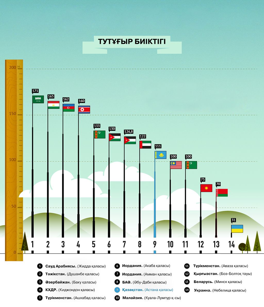 Ал әлгілер түзген рейтингтегі көштің ба­сын 171 метрлік тұғырға ту тіккен Сауд Ара­­­­­­бия­­­­сының Жидда шаһары бастайды. Дәл со­­дан кейінгі орынды Душанбедегі 165 метр­лік Тәжік­­­станның бас байрағы иемденіпті. Үштік­ті түйіндеу Әзербайжанның Баку қаласына бұйырған сияқты. Мұндағы тудың биіктігі – 162 метр. Одан кейінгі орынға КХДР-дің Киджондон қаласы жайғасқан. Бұл елдің алып туы 160 метрлік деңгейде. Жоғары­дағы тізімді одан әрмен Түрікменстанның Ашха­бады жалғайды. Бұл елдің бас байрағы 133 метр биіктіктен желбірейді екен. Тіпті, бір-бірі­нен асырып, қос-қостан тутұғыр қойған мем­ле­кеттер де табылды. Мәселен, 2003 жылы Иорда­ния­ның астанасы Амман қаласы үшін 128,5 метрлік флагшток арнайы жасалған. Ал кейін­нен осы елдің Акаба шаһарында одан да биік ту пайда болды. Оның биіктігі  136 метр­ді құрады. Тағы бір мемлекеттің бас туы 122 метр­лік деңгейде орналасыпты. Бұл Біріккен Араб Әмірліктерінің Әбу-Даби шаһары болатын.