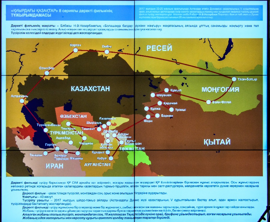 Түсірілім тобы жұмысын – Ресейдегі қазақтар шоғыр қоныстанған Астрахань, Омбы, Орынбор, Қорған қалаларынан бастап, Түрікменстанның – Түрікменбашы, Ташауыз, Ашхабад, Чарджоу өңірлерін қамтып, Өзбекстан елінің – Бостандық ауданы, Ташкент, Шыршық, Ғазалкентінде аялдап, ары қарай Тәжікстан жеріндегі – Душанбе, Соғды, Таулы Бадахшан, Хатлон өлкелерінде жалғастырады. Одан кейін ШҰАР-ға қарасты Үрімші, Құмыл, Қарамай, Баркөл, Шәуешек, Құлжа, Мори сияқты аймақ-аудандарды аралап, Моңғолияға өтеді. Келесі кезекте Иран Республикасының Горган, Бендер-Түрікмен, Тегеран, Мешхед қалалары мен Ауғанстан жеріндегі Кабул, Құндыз провинцияларында түсірілім жұмысын жүргізеді.