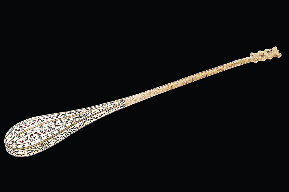 Жасаушы шебер домбыраның сүйек көмкерілген қапталын үзбе иір өрнекпен сәндеп, қаптал жиегін жағалата сүйек түймемен шекіте бекіткен. Ал, сыртқы дүмді шанағына жалпақ сүйекті ұзынша тіліп әдемі қиюластырып, сауыр-қапталына ілмелі өрнек салған екен. Музей қызметкерлерінің айтуына қарағанда, домбыраның сыртынан кигізетін әсем қабы да болған көрінеді.