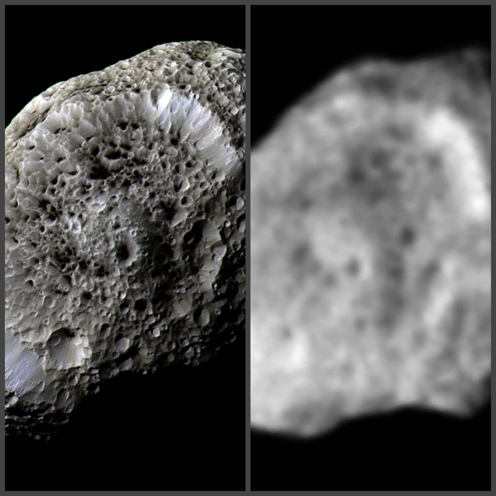 (Сол жақта - Кассини түсірген сурет, оң жақта - Вояджер түсірген сурет)