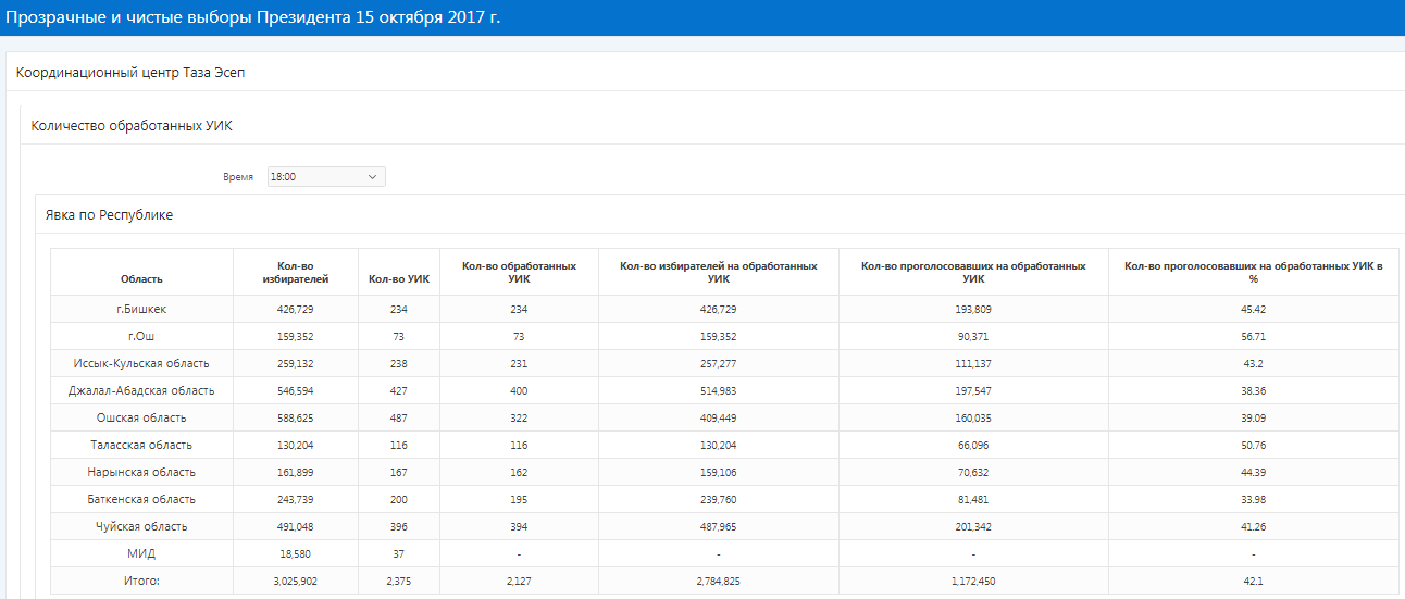 Республикадағы сайлаушылардың 42,1 пайызы дауыс берді. «Таза Эсеп» Үйлестіру Орталығы 18.00-де осындай деректерді ұсынды.