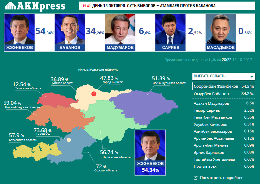 Мәліметтер бойынша, Сооронбай Жээнбеков көш бастап, сайлаушылардың 54.34%-ның қолдауына ие болды. Оған Ош, Жалал-Абад және Нарын облыстарының тұрғындарының басым бөлігі дауыс берген. Екінші орынға 34.26% дауыспен Омурбек Бабанов орналасты. Оған көбінесе Талас, Шу, Ыссық-Көл облыстарының сайлаушылары қолдау білдірген.