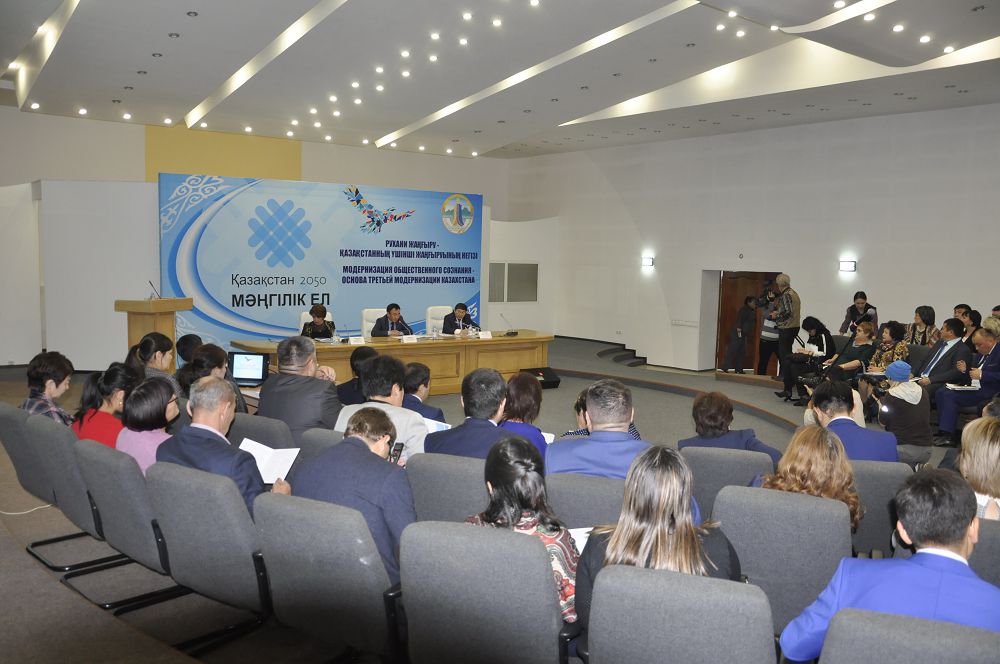 Жиынды сөз сөйлеп ашқан Ақмола облыстық ішкі саясат басқармасы басшысының міндетін атқарушы Архат Айбабин «Рухани жаңғыру» бағдарламасы бойынша өңірімізде 107 жоба қолға алынғандығын атап көрсетті. Солардың ең бастылары Бурабай, Қорғалжын және Зеренді аудандарында шоғырланғандығын айта кеткен жөн. «Бурабай ауданы бойынша «Абылай хан алаңы» мемориалдық стелласы, Ерейментау ауданында «Құмай» археологиялық кешені салынды және де Қорғалжын ауданында көптеген шаруалар атқарылуда. Сонымен қатар білім, мәдениет саласында көптеген шаралар назардан тыс қалмаған. Облысымыз табиғи байлықтары ғана емес, сонымен бірге рухани құндылықтары да мол өңір саналады. Сондықтан да «Рухани жаңғыру» бағдарламасы бойынша үлкен үлес қосатынымызға нық сенімдіміз», деді А.Айбабин.