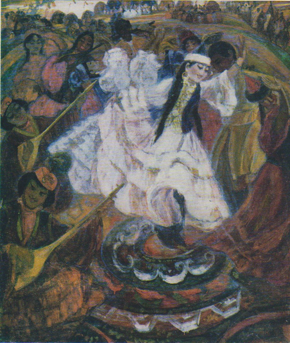 1958 жылы «Қазақтың ұлттық киімдері» атты альбом шығарды. Суреттерін топтастырған кітаптар да жарық көрді. Соның бірін парақтап отырып, «Қуанышты күн» атты картинасы ерекше көз тартты. Суреттің бояуынан бұрын мазмұнын түсінуге тырыстым. Мұнда суретші күзгі жиын-терін аяқталғаннан кейінгі сабан тойды бейнелегенге ұқсайды. Қоңыр күз. Ортада ұлттық киім киген қыз шыр көбелек айнала билеп жүр. Маңайына жиналған қыздар қоңыр домбырадан күмбірлете күй төгіп отыр. Арғы планда қызыл түсті жалаулар желбірейді. Бәйге, күрес, арқаланған адамдар. Бұл полотнода қылқалам шебері халықтың қуанышын, рухын, көңіл күйін сезіне отырып жеткізген.
