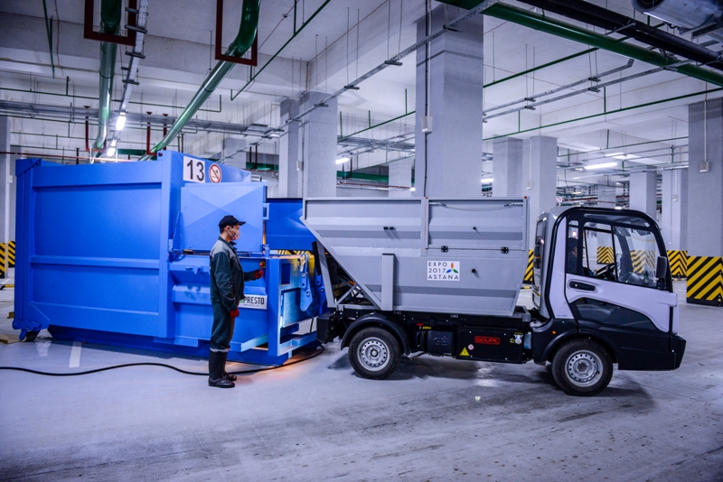 Көрме аумағында қоқыс жинау үшін арнайы ақылды қоқыс жәшіктері орнатылды. Олардың жұмыс істеу жүйесі үшке бөлінді – қағаздарға, пластиктерге және аралас қалдықтарға арналған. Олар күн сәулесі батареясы арқылы жұмыс жасайды, ал ішінде нығыздауға арналған тығыздаушы орналасқан, ол қоқыс көлемін 10 есеге азайтуға септігін тигізеді. «Осының арқасында біз орналастырылатын қоқыс жәшіктерін едеуір үнемдедік, ал осы орындарға стандартты қалалық қоқыс жәшіктерінен бізге 30 еседен көп қажет болар еді», дейді «Tau Innovative Solutions» серіктестігінің басқарушысы Руслан Жемков. Оның сөзіне қарағанда, көрме жұмыс істеген уақыт ішінде 17 759 текше метр қоқыс шығарылған. Енді елестетіп көрелік, әдетте тұрғын үйлердің аулаларында орнатылатын қоқысқа арналған металдан жасалған классикалық контейнерлердің аумағы 0,75 текше метр. Егер біз барлық қоқысты сондай контейнерлерге жинаған болсақ, онда бізге ондайдың 23 412 данасы керек.