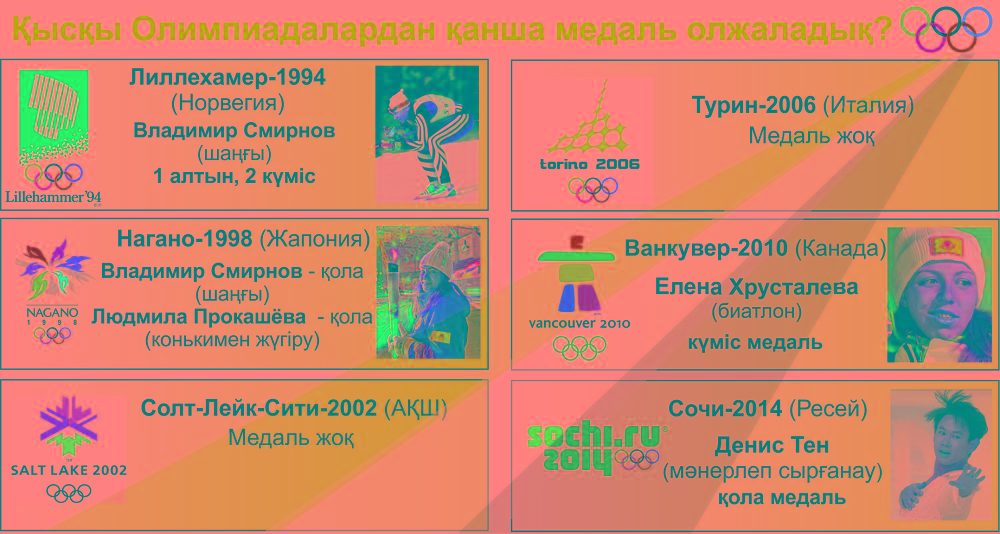 Қысқы Олимпия ойындарына (ҚОО) Тәуелсіз мемлекет ретінде 1994 жылдан бері тұрақты түрде қатысып келе жатқан Қазақстан ұлттық құрамасы биыл реттік сан бойынша ақ қар, көк мұз үс­тінде өтетін аламанға жетінші рет қатыспақ. Бұған дейінгі ал­ты Олим­пия ойындарында еліміздің спортшылары жеті медаль жеңіп алған. Тарқатып айтар болсақ, 1994 жылы Норвегияның Лиллехамер қаласында өт­кен төрт жылдықтың басты бә­секе­сінде шаңғышы – Владимир Смирновтың жалғыз өзі бір ал­тын және екі күміс медаль иеле­ніп, айды аспанға бір-ақ шы­ғарды.