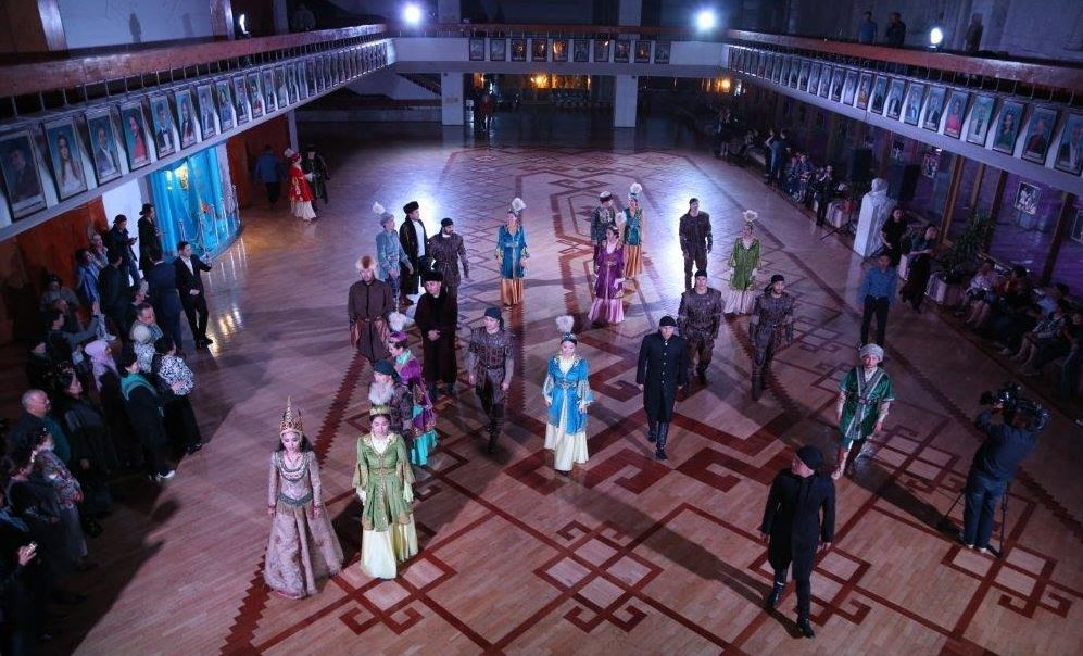 Абайдың «Айттым сәлем Қаламқас» өлеңін әуелете шырқаған актерлер тобы көрермен қауымды театрдың екі қанатына тізілген көркем дүниелерді тамашалауға шақырды.