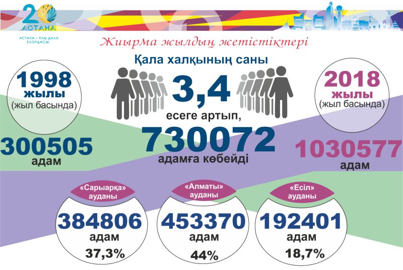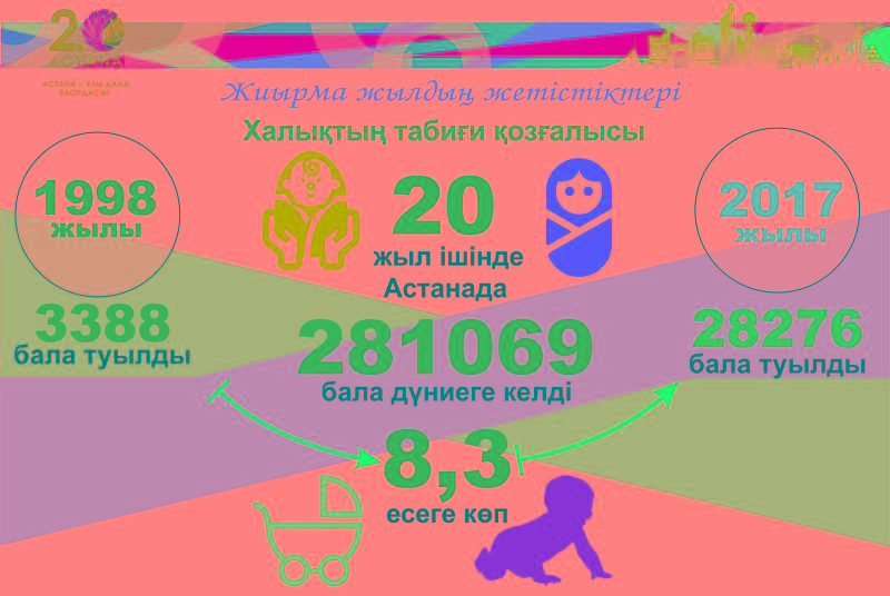 Өткен 20 жыл ішінде Астанада 281 069 бала (Республика бойынша тоғызыншы көрсеткіш) дүниеге келді. 2017 жылы астанада 28 276 бала туылды, бұл 1998 жылға қарағанда 8,3 есеге (3 388 адам) көп. Астана халқының табиғи өсуі 20 жылда 212 543 адамды құрады, 2017 жылғы өсуі 24 374 адамды құрады, бұл 1998 жылға қарағанда 73 есеге көп.
