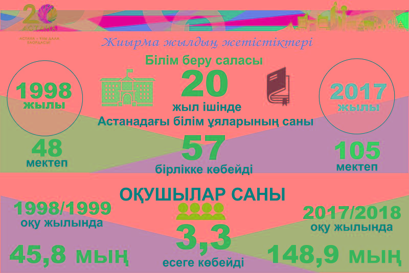 1998-1999 оқу жылдарында бас қаламызда 48 мектеп жұмыс істесе, бүгінде олардың саны 105 мектепке жетті. Жиырма жыл ішінде оқушылар саны 45,8 мың адамнан 148,9 мың адамға жетіп, 3,3 есеге артты. Сонымен бірге қаламызда дарынды балаларға арналған 3 заманауи мектеп жұмыс істейді.