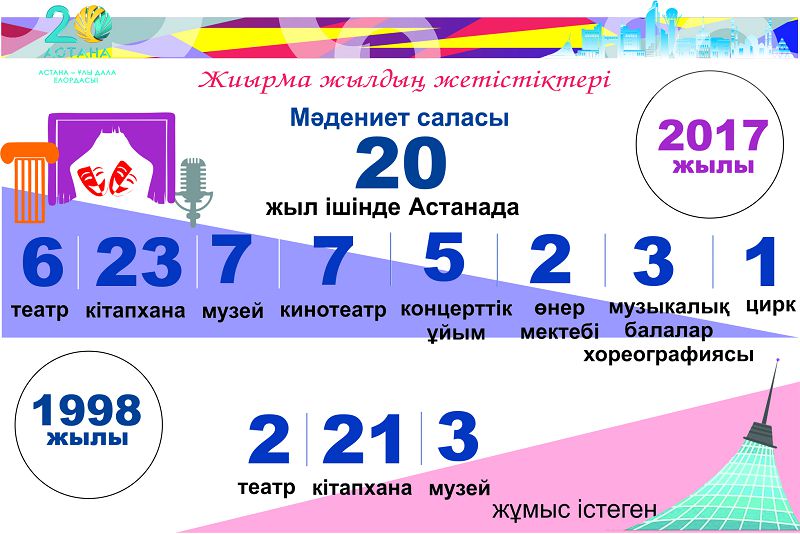 Сондай-ақ Астана республиканың басты мәдени және рухани орталығы болып табылады. Бүгінгі таңда елорда жұртына 6 театр, 23 кітапхана, 7 музей, 1 цирк, 7 кинотеатр, 5 концерттік ұйым мен өнер академиясы, 2 өнер мектебі, 3 балалар музыкалық мектебі, Қазақ ұлттық хореография академиясы қызмет көрсетеді. 1998 жылы қаламызда 2 театр, 3 мұражай, 21 кітапхана ғана жұмыс істеген болатын. Осыдан-ақ астаналықтардың мәдени және рухани сұранысының қаншалықты жоғары екендігін аңғаруға болады.