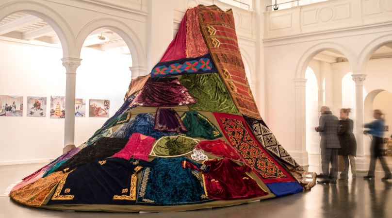1930–1940 жылдар аралығындағы Қазақ КСР-ның күрделі тарихы және 1991 жылы тәуелсіздік алған уақыттан бері республиканың қарқынды дамуы еліміздің заманауи өнерінде айқын көрініс тапқан өзіндік идеялардың пайда болуына жол ашты. Көрменің кураторы Дэвид Эллиоттың айтуынша, көрме орыс авангардынан басталады, алайда экспозиция сәндік-қолданбалы өнер экспонаты — текеметпен ашылады.