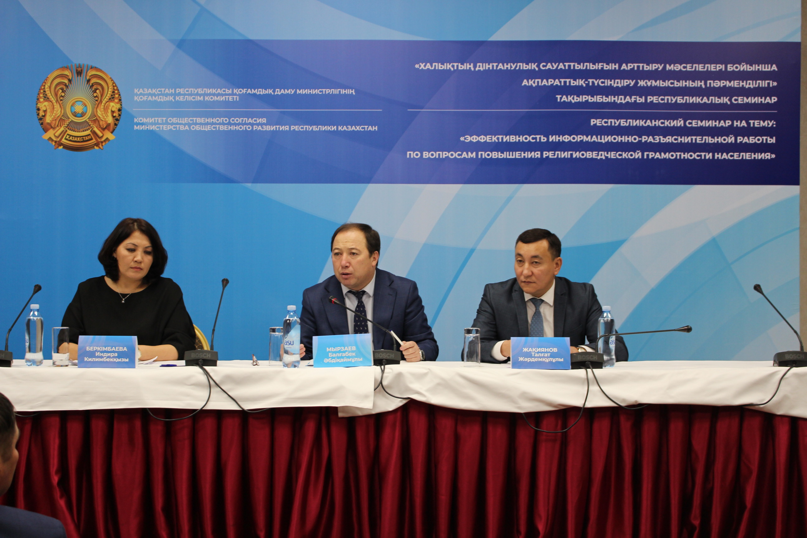 Семинарда Қоғамдық келісім комитетінің Төраға орынбасары Балғабек Мырзаев дін тақырыбының бүгінгі қоғамда аса өзекті екенін айта келіп, теріс ағымдағы топтардың өз қатарластарын толтыру мақсатында түрлі әрекеттерге барып жатқандығын жеткізді.