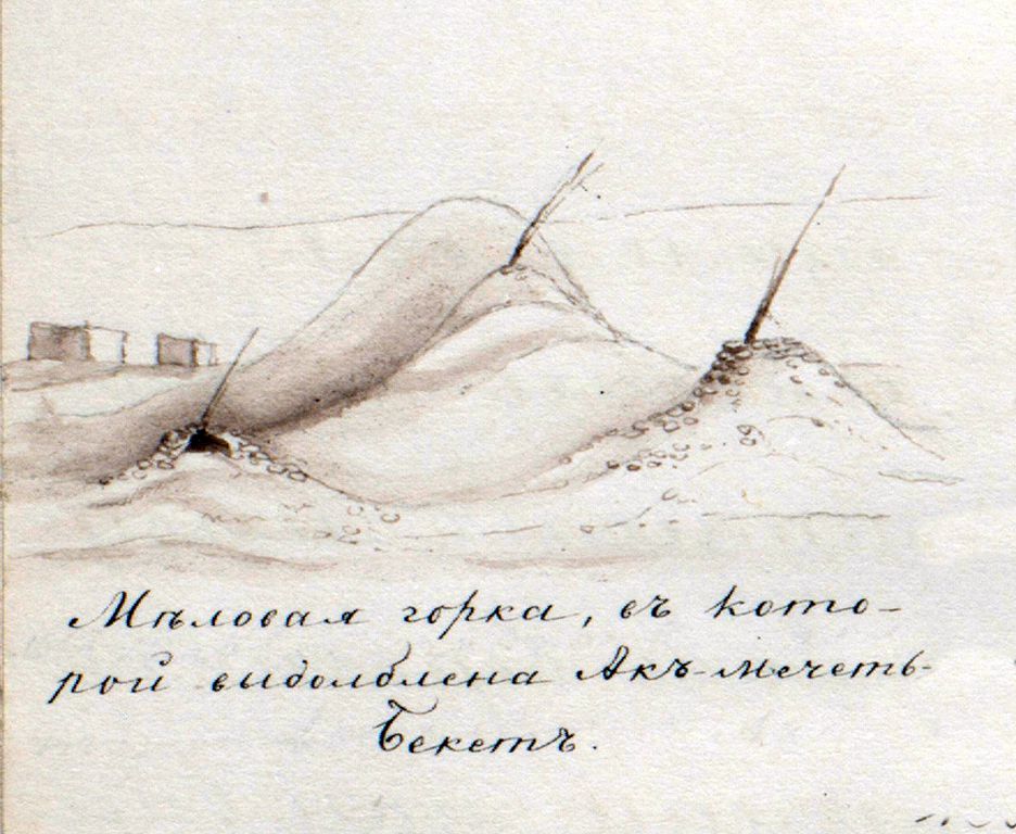 Бекет ата салған жерасты мешіті туралы толыққанды және құнды мәлімет 1851-1852 жылдары Жем өзені мен Үстірт аралығындағы зерттеу жұмысын жүргізген топограф Алексеевтің жазбасында кездеседі. Топограф Ақмешіт қорымындағы жер асты мешітін төмендегідей суреттейді. «Қорымның өзен жақ беткейінде қасқырдың үңгіріне ұқсас, адам әзер өтетін саңылау бар. Бұл саңылау оңтүстік батысқа қарай жердің түбіне 3 саженнен (1 сажен – 2,1 метр) көп емес қашықтыққа созылып, әрі қарай диаметрі 2 ½ сажен, биіктігі 4 аршынға (1аршын – 0,7 метр) дейін баратын дөңгелек пішінді (бірінші) бөлмеге апарады. Бөлменің төбесі тегіс күмбезделген, ортасында күннің көзі түсетіндей жіңішке саңылау қалдырылған. Бөлменің кірер жеріне дейінгі екі жағында көмілген шұңқыр орындары бар. Қырғыздардың (қазақтардың) айтуынша ол тұщы су өнген құдық. Осы бөлменің оң жағында кішкентай бөлме орналасқан, оны бірінші бөлмемен есік бөліп тұр. Есікке үшкір ұшы төмен қарай қаратылған темір асатаяқ қойылған. Бірінші бөлменің оңтүстік батыс қабырғасында келесі бір есік қашап салынған, ол дөңгелек пішінді келесі бөлмеге апарады. Бұл бөлменің өлшемі алдыңғысына қарағанда үлкенірек, күмбезі жоғары қаратылып, төрт қырлы бағанамен тіреліп, ортасы ойылған. Бөлменің қабырғалары тегіс дөңгелек емес, ол 6 симметриялық қуыстардан тұрады. Оның ішінде есікке қарсы тұрғаны жалпағырақ және тереңірек болғандықтан татар мешітіне ұқсайды. Бөлмеде еден жоқ, қабырғалары тегіс емес болғанымен де, дұрыс жасалған. Үңгіп салынған мешіттің жері мықты бордан тұрады. Мешіттің бетінде, яғни үстінде бордан екі немесе үш төмпешік үйілген, ол қайтыс болған қырғыздардың (қазақтардың) қабірі секілді. Үйіндіге бірнеше ағаш сырықтар қадалып, оған киімнен жыртылып алынған шүберектер мен жылқының қылы байланып, сүйектер үйілген». Топограф бұл әрекеттің барлығын көшпелілердің киелі орынды құрметтеу бағытында жасаған діни қадамы деп түсіндіреді.