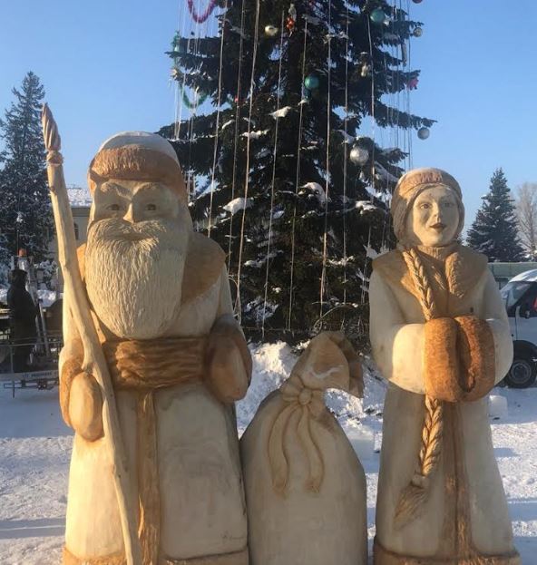 Ерекшелігі сол, Жаңа жылдың бас кейіпкерлері қар мен мұздан емес, ағаштан жасалған. Иә, Алтайдың ағашынан. Тамаша туындының авторы – жергілікті шебер Иван Куртуков. «Аяз ата мен Ақшақарды жасап шығу оңайға түскен жоқ. Лайықты материал табу қиынға соқты. Осы ретте Малеев ауылдық округі көмекке келіп, сынған терек тауып берді. Туындысы сәтті шығуы үшін Иван күн, түн демей, бір жарым-екі ай тер төкті. Аяз атаның биіктігі 2 жарым метр, салмағы 700 келі тартса, Ақшақардың бойы 2 метр, 300 сантиметр, салмағы – жарты тонна», - дейді шебердің жұбайы Юлия Куртукова.