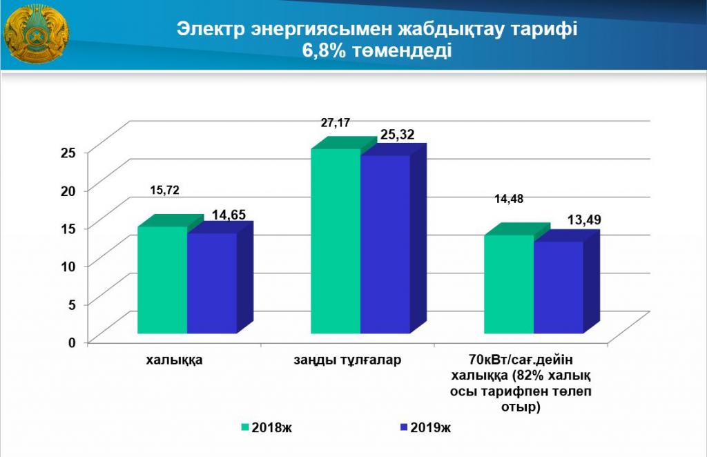 «Тасымалдау және өндіруші станциялардың тарифінің төмендеуі есебінен түпкілікті тарифтің төмендеуі 6,8 пайызды кұрайды, яғни халыққа 14,48 теңгеден 13,49 теңгеге деиін төмендейді. Сонымен қатар, 2019 жылдың 1 қаңтарынан бастап тұтынушылардың қордаланған қарызы үшін электр энергиясынан қайта қосу төлемі 40 пайызға төмендетіледі», деді Ерболат Мақсұтханұлы.