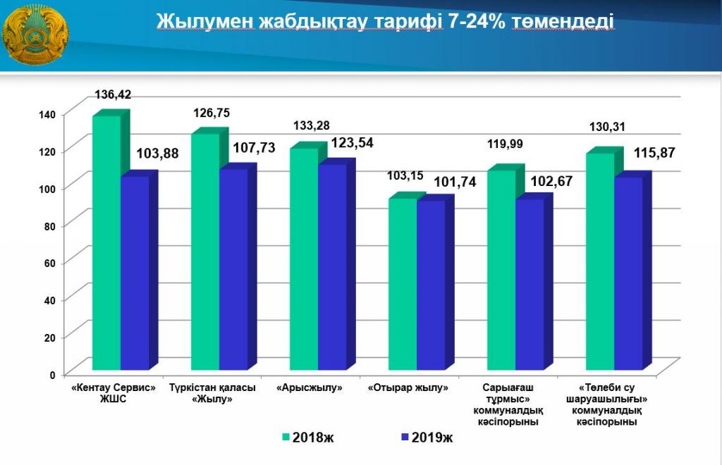 Бұдан өзге, ауыз су, ағын су және су бұру қызметімен айналысатын субъектілдің ішінен 2019 жылдың 1 қаңтарынан бастап 39 субъектінің тарифтері 5–13 пайыз аралығында төмендетілетін болады.