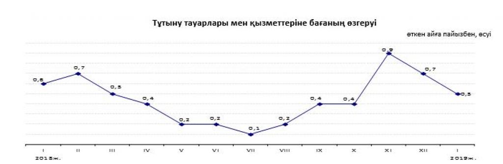 2019 жылғы қаңтардан бастап ТБИ–ді есептегенде азық–түлік тауарларының үлесі – 38,8%, азық–түлік емес тауарлар – 29,8%, ақылы қызметтер 31,4%–ды құрады.