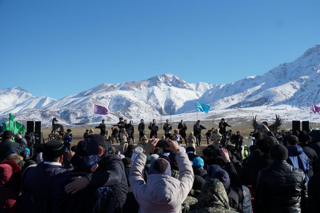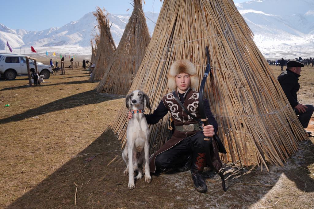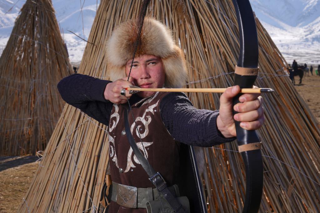 Шошайта тігілген қостың маңдайындағы «Түркістан» деген жазуға, онан қала берді ыңғайлы, ықшам киінген әкелі-балалы қос құсбегі көрерменнің назарын өзіне аударып бара жатыр.