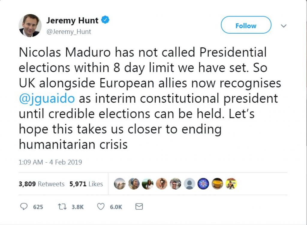 «Біріккен Корольдік еуропалық одақтастармен бірге Гуайдоны сайлауға дейін уақытша Конституциялық Президент деп таниды» деп жазды Британия СІМ басшысы Джереми Хант өзінің Твиттердегі парақшасында.