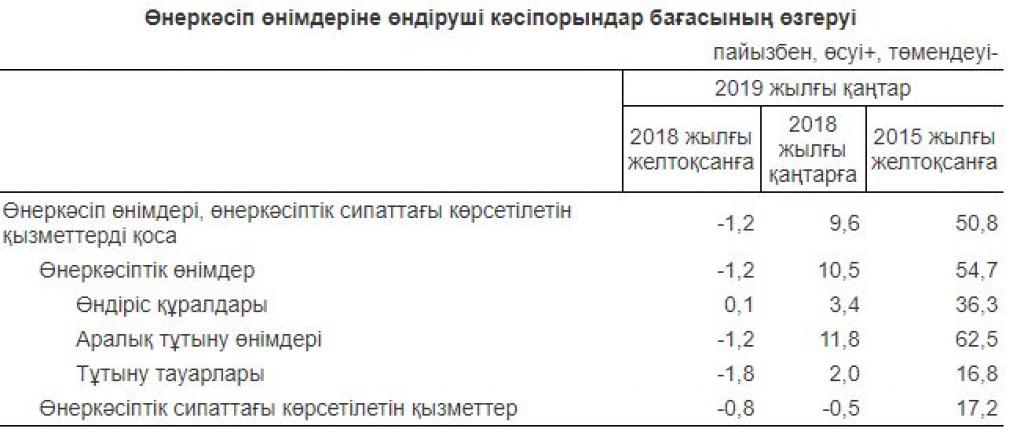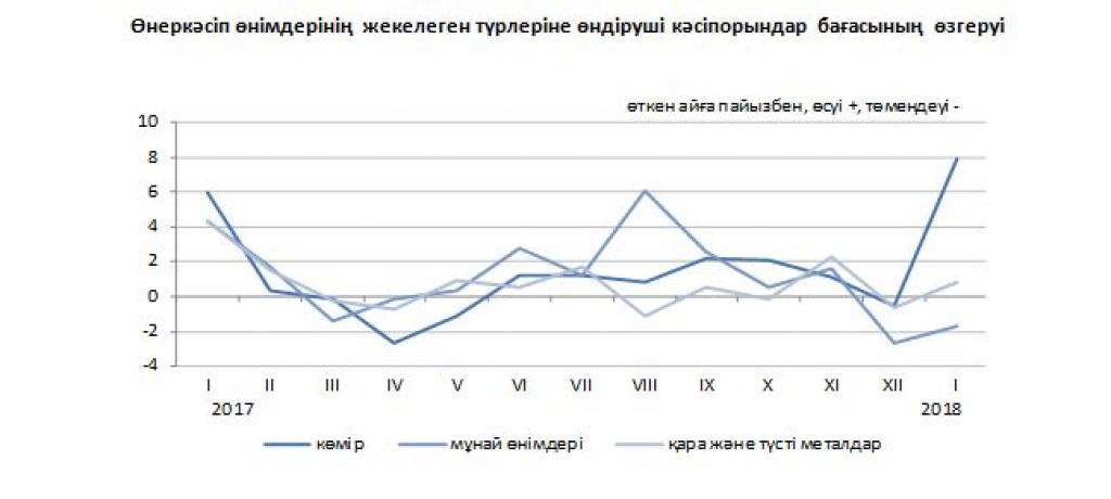 Өткен айда өндіруші кәсіпорындар бағасы бензинге, сұйытылған пропан және бутанға 5%-дан, мұнайға - 2,9%, мазутқа 1,4%-ға төмендеді, көмірге - 7,9%, табиғи газға - 1,5%, металл кендеріне 0,5%-ға жоғарылады.
