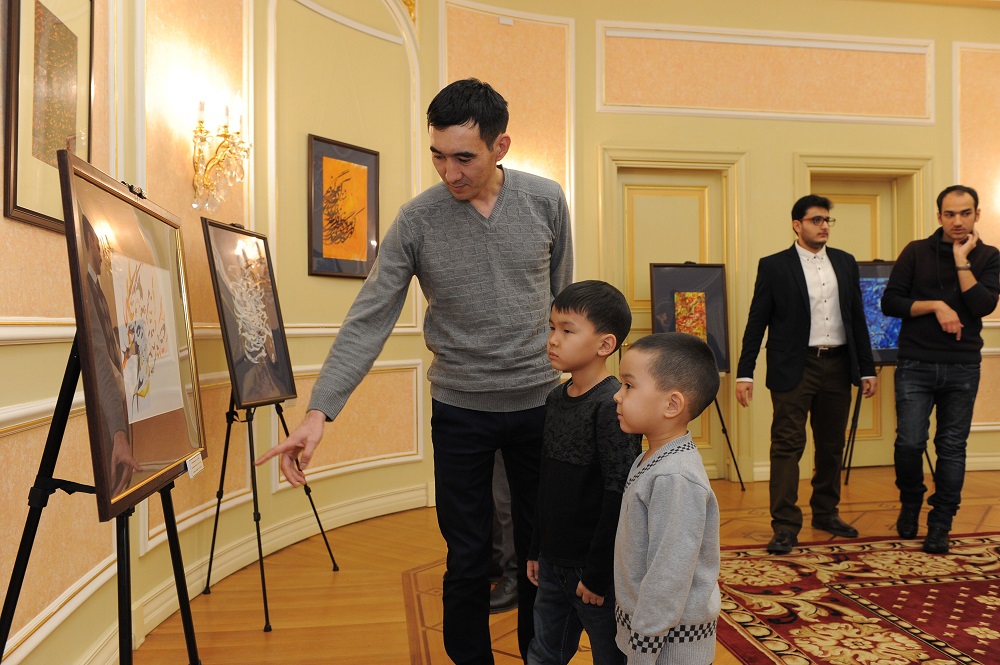 – Сіздерге шақыруды қабылдап, осы шараға қатысып отырғандарыңыз үшін алғыс білдіремін! Осы өнер көрмесінде Сіздерді қарсы алу мен үшін үлкен құрмет. Ерте заманнан бастап қазіргі уақытқа дейін иранның жазу өнері үнемі дамытылып отырған. Соңғы жылдардағы осындай маңызды өзгерістердің бірі - «жазу суреті» деп аталатын дәстүрлі каллиграфияны қазіргі заманғы сурет өнерімен байланыстыру. Бүгінгі көрмеде көрермендерге осы өнер саласының үздік өнерпазы Саид Хушманеш мырзаның туындылары ұсынылып отыр. Сіздерді осы туындыларды тамашалауға шақырамын, – деді Елші.