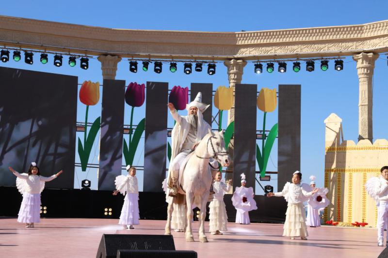 Мерекелік шара 500-ден астам адам қатысқан «Әз – Наурыз-татулық мерекесі!» атты театрландырылған қойылымнан басталды. Маңғыстау әртістері өз қойылымдарында Елбасы Нұрсұлтан Назарбаевтың «Ұлы даланың жеті қыры» мақаласында айтылған қазақ даласында өмір сүрген ежелгі көшпелі халықтардың жеті қазынасын көрсетті. Қойылым үш актіден тұратын Ұлы Жібек жолы керуені көрсетілді. Жағалауда ат, түйе, қазақтың тазы иттері мен бүркіттері жүріп өтті.