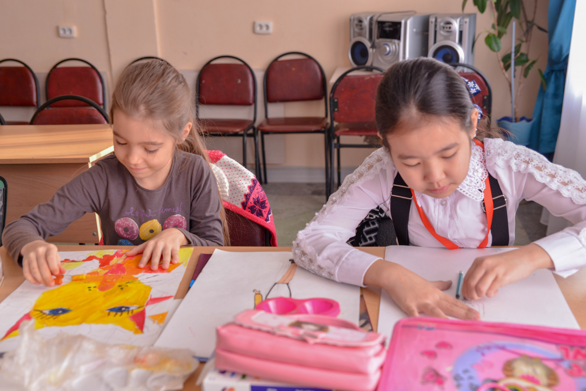 Химия кабинетіне негізінен жоғарғы сынып оқушылары топтасқан. Олар мұнда түрлі химия пәніне қатысты дәрістер тыңдайды.