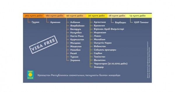 Қазақстан азаматтары Аргентина, Бразилия, Индонезия, Ливан, Малайзия, БАӘ, Сейшель аралдары, Сербия, Тәжікстан, Өзбекстан, Филиппин, Черногория, Оңтүстік Корея, Эквадорда визасыз 30 күнге дейін бола алады.