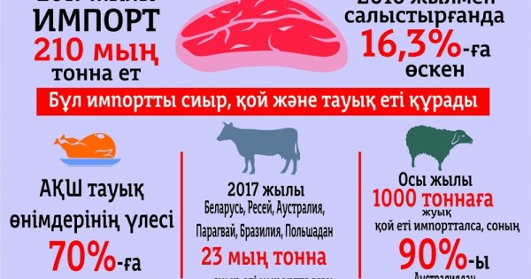 Дерек бойынша елімізге 2017 жылы шетелде өндірілген 210 мың тонна ет импортталған. Өкініштісі, бұл сұраныс жыл сайын артып келеді. Осы 2017 жылы сырттан кірген ет өнімі арғы жылмен салыстырғанда 16,3 пайызға өскен. Шекара асып келген ет өнімдерінің үле­сін сиыр, қой және тауық еті құ­ра­ды. Қазақстанға «тауық си­ра­ғын» экспорттауда Америка топ жарып тұр. Нарықтағы АҚШ тауық өнімдерінің үлесі 70 пайызға дейін жеткен. Ал сау­да сөрелеріндегі сиыр еті мен оның өнімдерін Беларусь, Ресей, Аус­трия, Парагвай, Бразилия, По­ль­ша мемлекетінде жасалған тауар құрады. 2017 жылы бұл ел­дер­ден 23 мың тонна сиыр еті Қазақ­станға жеткізілген. Осы жы­л­ы 1 000 тоннаға жуық қой еті қазақ­­тың қазанында қайнаған болса, оның 90 пайызға жуығы А­ус­т­­рия­дан келген импорт екен.