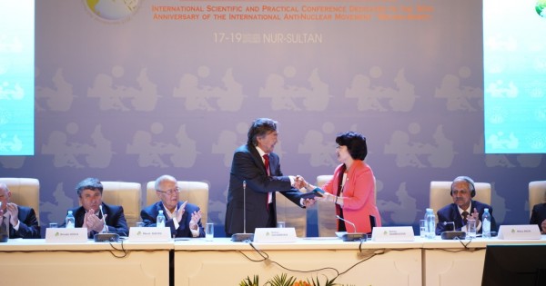 Конференцияның ашылуында сөз алған Мәдениет және спорт министрі А. Райымқұлова жиналғандарға Қазақстанның Тұңғыш Президенті – Елбасы Н. Назарбаевтың құттықтау хатын оқып берді. Бүгінгі құттықтауы мен ядролық сынақты тоқтатуға қосқан еңбегіне ризашылық білдірген ақын, «Невада-Семей» антиядролық қозғалысының көшбасшысы О. Сүлейменов Елбасы Н. Назарбаевқа қозғалыстың 30 жылдығына арнап шығарылған мерейтойлық медалін тапсырды. Сондай-ақ мерейтойлық медаль Мәдениет және спорт министріне де тапсырылды.