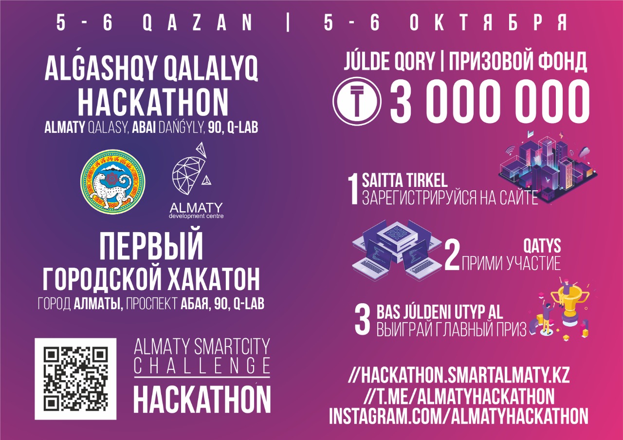 5-6 қазанда өтетін Q-Lab қалалық жобалар зертханасында (Абай даңғ.,90) бағдарламалық өнімдерді отандық әзірлеушілер жаңа цифрлық сервистер мен өнімдерді әзірлеу және таныстыру мақсатында команда жасақталады.