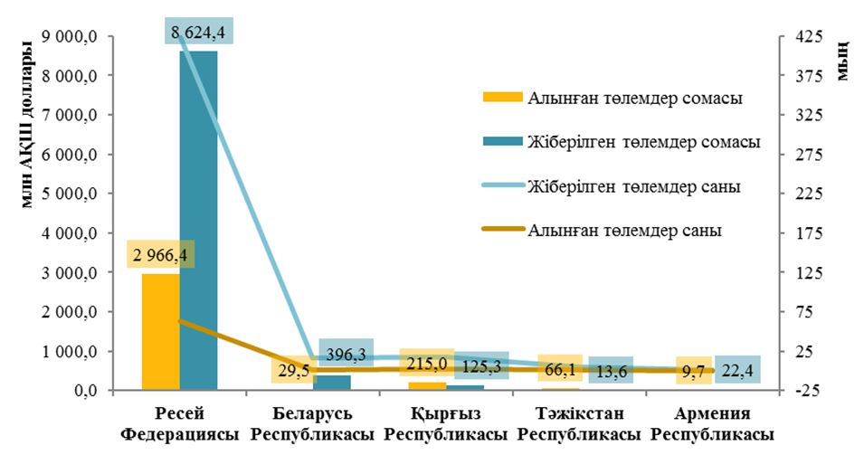 Тауарлар мен қызметтердің экспорты мен импорты үшін операциялардың басым бөлігі Қазақстан мен Ресей арасында жүргізілді. Мәселен, Ресейден импортталатын тауарлар мен қызметтер үшін төлемдер үлесіне жалпы көрсеткіштің 91,5%-ы және ЕАЭО-ға мүше мемлекеттерден импортталатын тауарлар мен қызметтер үшін төлемдердің жалпы сомасынан 93,9%-ы тиесілі. Ал Ресейге экспортталатын тауарлар мен қызметтер үшін төлемдер үлесіне жалпы санның 92,3%-ы және ЕАЭО елдеріне экспортталатын тауарлар мен қызметтер үшін төлемдердің жалпы сомасынан 90,3%-ы тиесілі екенін айта кетелік.