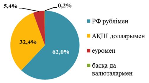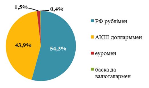 Ресей Федерациясымен есеп айырысудың негізгі бөлігі Ресей рублімен жүзеге асырылды, оның үлесіне импортталатын және экспортталатын тауарлар мен қызметтер үшін төлемдердің жалпы көлемінен тиісінше 62%-ы (жіберілген төлемдер) және 54,3%-ы (алынған төлемдер) тиесілі. АҚШ долларының үлесіне тиісінше 32,4% және 43,9%-ы тиесілі. Өзара есеп айырысудағы қалған валюталардың үлесі импортталатын және экспортталатын тауарлар мен қызметтер үшін төлемдердің жалпы көлемінен тиісінше 5,6% және 1,9% болды.