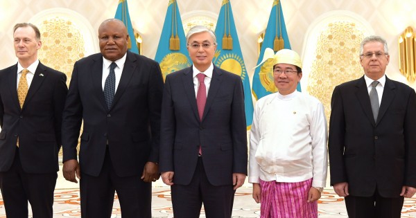 «Ақорда» резиденциясында өткен салтанатты рәсімде Мемлекет басшысына Австралия елшісі Грейм Михан, Кипр елшісі Андреас Зинонос, Конго елшісі Давид Мадука, Мьянма елшісі Ко Ко Шейн сенім грамоталарын тапсырды.