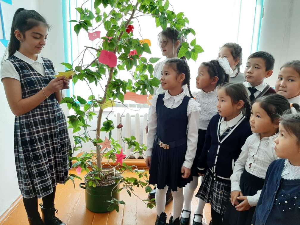Гүл ағашындағы жұлдызшаларға жазылған нақыл сөздерді, өлеңдерді кезектесіп ауыстырып отырады. Барлығы да «Кітап жанашырлары» үйірмесінің мүшелері.