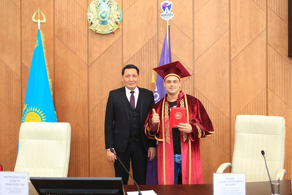 Қайрат Еңбекшіұлы спортшыға құрмет көрсетіп, оқу орнының «Құрметті профессоры» куәлігін табыс етті.