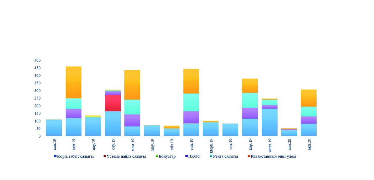 Айлар бойынша түсімдерді бөлу кезінде, ағымдағы жылдың қаңтарында Ұлттық қорға түсетін салық түсімдері 2019 жылдың қаңтарымен салыстырғанда 53,3%-ға азайып, 51 млрд теңгені құрады, ал ақпан айында түсімдер 33,3%-ға, 307 млрд теңгеге дейін азайды.