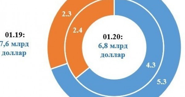 Экспорттан түсетін ақша түсімдерінің негізгі құлдырауы абсолюттік мәнде 2020 жылғы қаңтарда жанғыш пайдалы қазбаларға тура келді. Осылайша, мұнай экспортынан түскен табыс 744,1 млн долларға, газ сатудан түскен табыс 134,6 млн долларға төмендеді (1- кестені қараңыз). Аталған тауарлар экспортының физикалық көлемі тиісінше 13,2%- ға және 18,0%- ға төмендеді.
