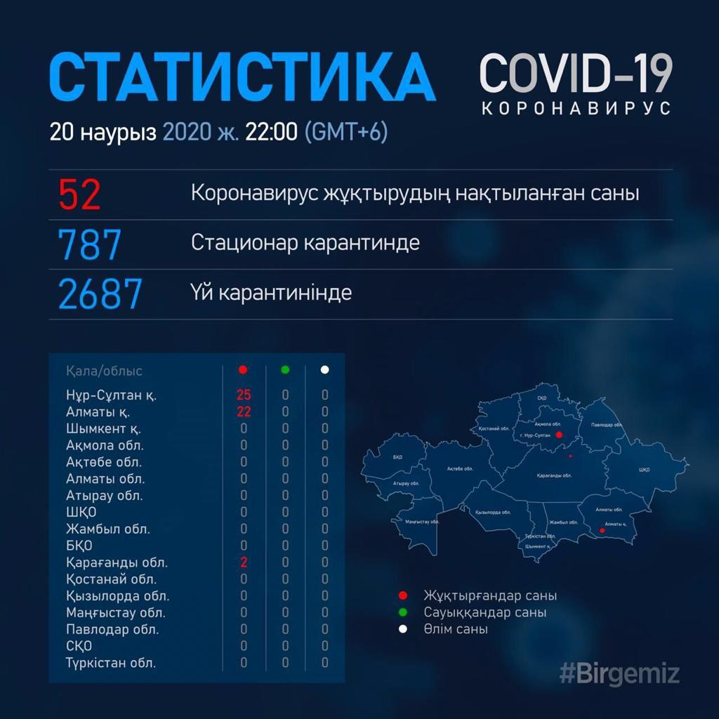 Осы сағатта Алматы қаласында – 22 адам, Нұр-Сұлтан қаласы бойынша 28 адам, Қарағанды қаласында - 2 адам, жалпы ел аумағында 52 науқас тіркелді.