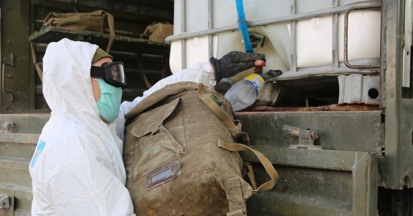Бүгінгі таңда 100-ге жуық әскери қызметші санитарлық жұмыстарға тартылған. Олар 20 адамнан тұратын 5 топқа бөлінген. Залалсыздандыру жұмыстары ИДК-1 жеке дегазациялық жиынтығы көмегімен жүзеге асырылады. Жинақ бүрку принципі арқылы жұмыс істейді. Бір кіреберісте, орта есеппен 20 литр ерітінді қажет.