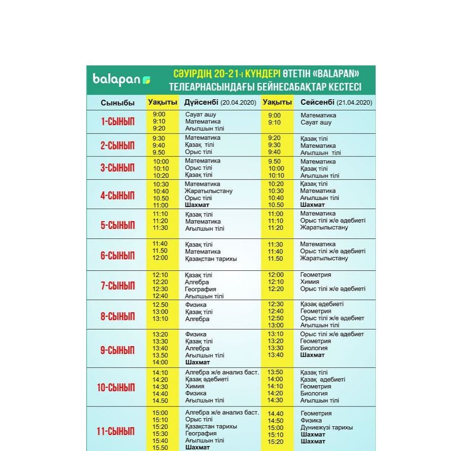 Мектеп оқушыларына 20-21 сәуірге арналған бейнесабақтар кестесі