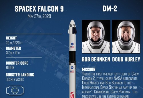 Falcon 9 ракетасымен жүзеге асатын ұшу биылғы 27 мамырға жоспарланған екен. Құрамында Даг Хөрли және Боб Бенкен бар экипаждың орбитада 110 тәулік болуы жоспарланған. NASA Халықаралық ғарыш стансасындағы жұмыс тоқтап қалмау үшін ұшуды коронавирус пандемиясына қарамастан жүзеге асырмақшы. Илон Масктің SpaceX сияқты жекеменшік компаниясы мұндай жетістікке 18 жылдан кейін жетпекші. Бірақ бұл тарихи оқиғаны көрермендер шолу алаңынан көзбе-көз көре алмайтыны өкінішті жағдай болып отыр.