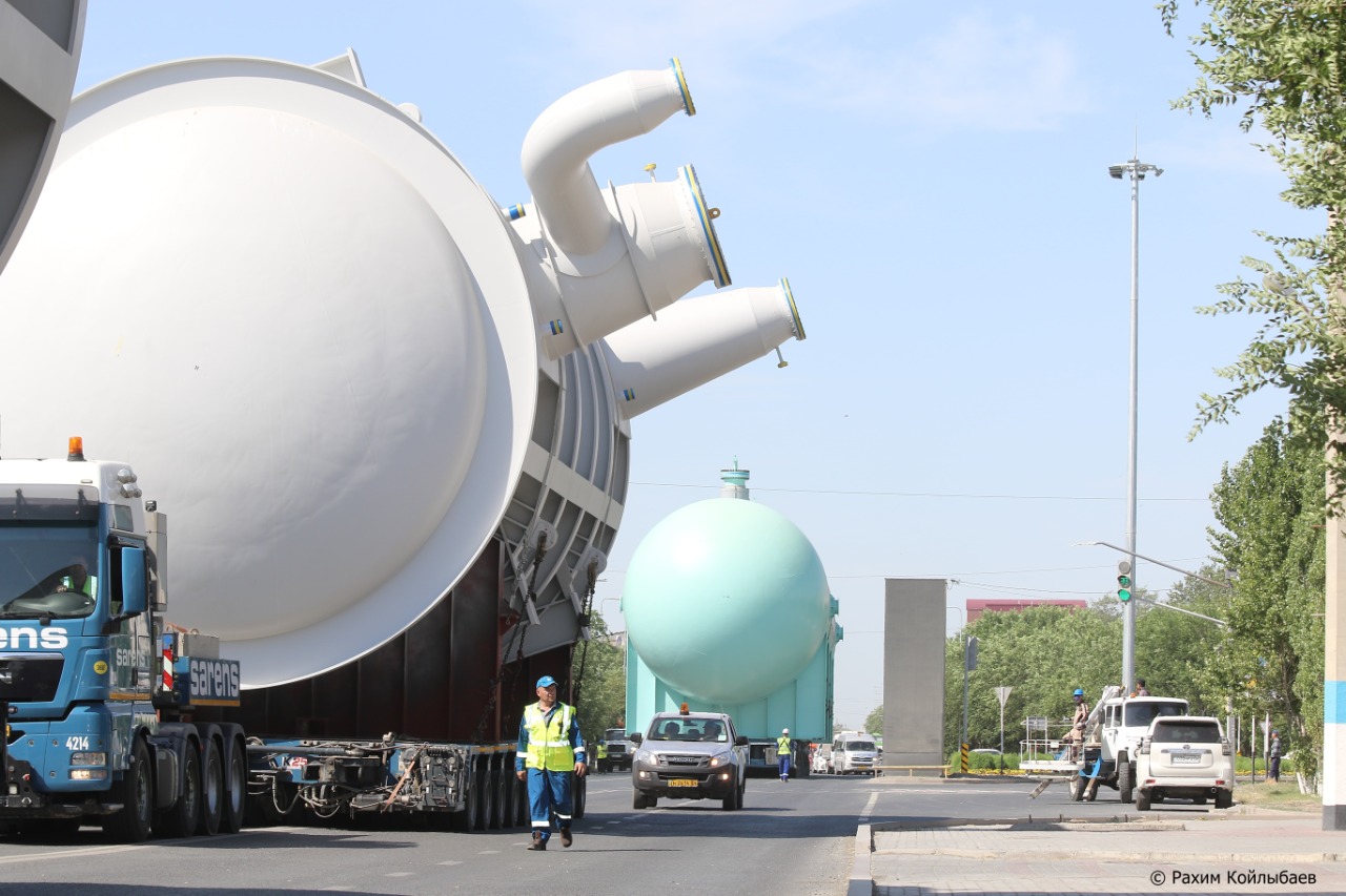 Бұл жүктер Оңтүстік Кореядан "АтырауӨзен" портына жеткізілген еді. Енді оны Қарабатан ауылының маңындағы газохимиялық зауытының құрылыс алаңына дейін тасымалдайды.