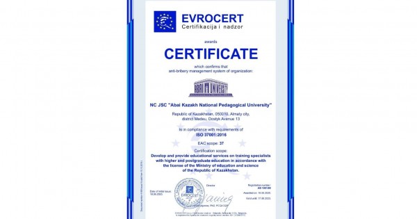 Өткізілген жұмыстың қорытындысы ретінде үстіміздегі жылдың 12 және 15 маусымында "Евросерт" компаниясы (E V R O C E R T Certifikacijainadzor sistemamenadąmenta SCG) сертификациялық аудит жүргізіп, оның нәтижесі бойынша Абай атындағы Қазақ ұлттық педагогикалық университетіне, олар енгізген сыбайлас жемқорлыққа қарсы іс-қимыл менеджменті жүйесі ХС ИСО 37001-2016 стандартының талаптарына сәйкес жұмыс жағдайында екендігі туралы белгіленген үлгідегі сертификат беру туралы алғаш рет шешім қабылданды.