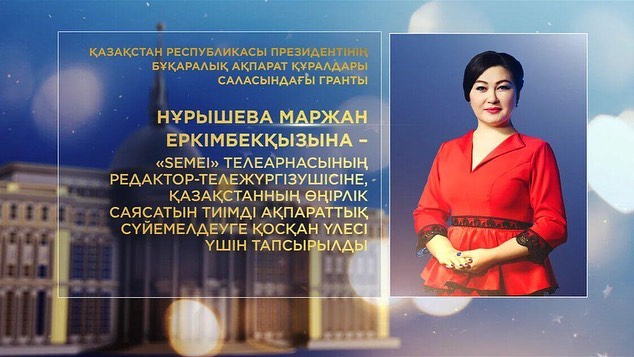Нұрышева Маржан Еркімбекқызына – "Semei" телеарнасының редактор-тележүргізушісіне, Қазақстанның өңірлік саясатын тиімді ақпараттық сүйемелдеуге қосқан үлесі үшін;