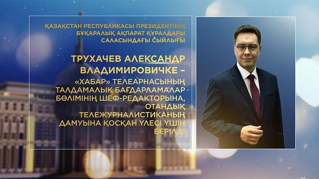 Трухачев Александр Владимировичке – "Хабар" телеарнасының талдамалық бағдарламалар бөлімінің шеф-редакторына, отандық тележурналистиканың дамуына қосқан үлесі үшін берілсін;